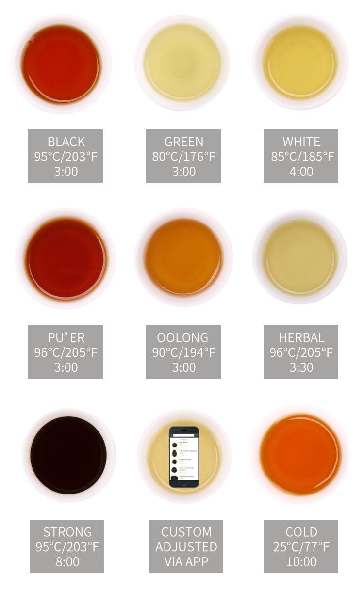 9 preset programs for your favorite loose leaf or bagged tea. Access many more on our app